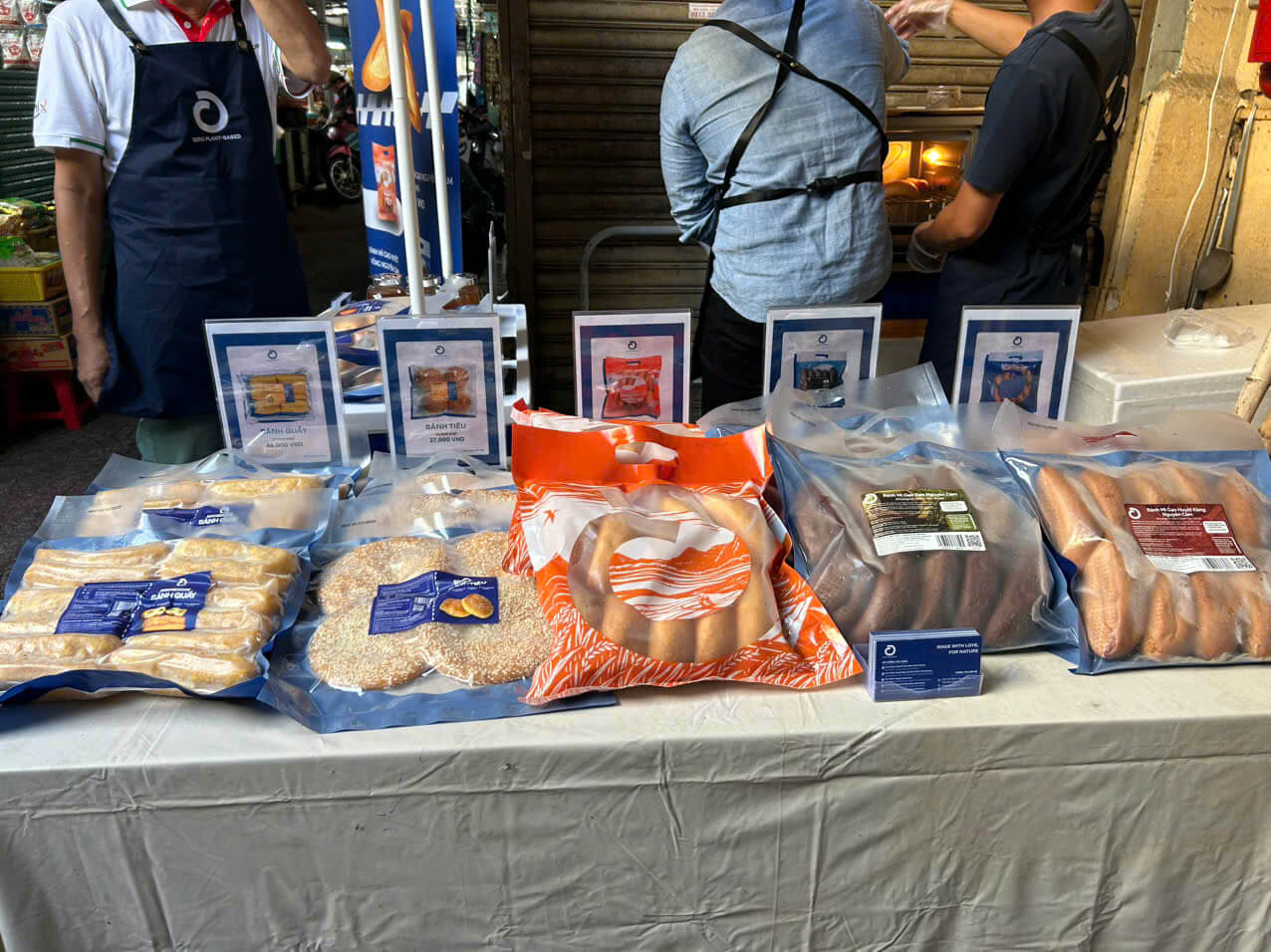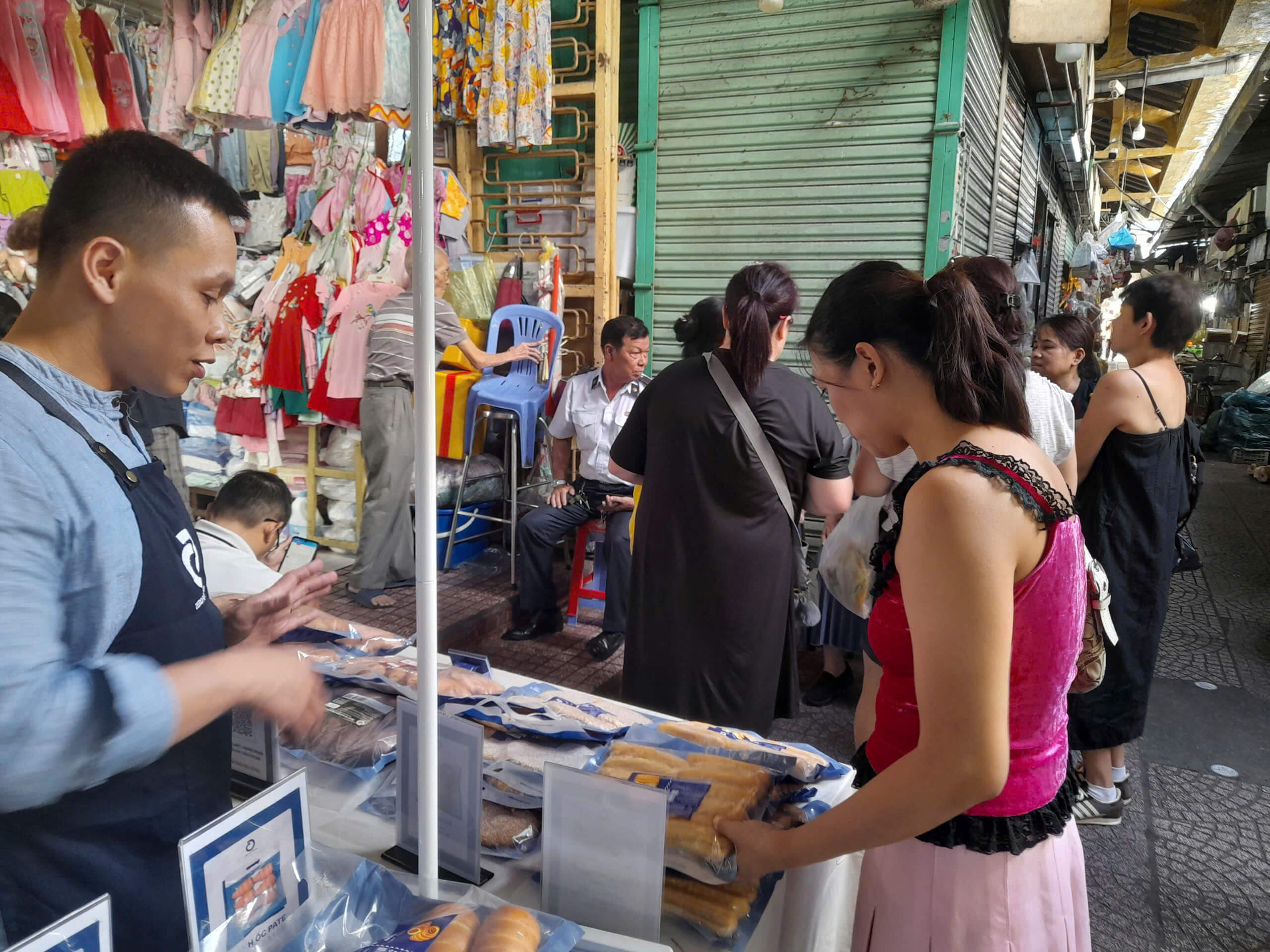 Từ rất sớm, đội ngũ đã có mặt để sắp xếp bàn, dựng backdrop, chuẩn bị lò nướng và trưng bày bánh. Gian hàng với tông xanh nổi bật tạo cảm giác thân thiện và dễ nhận diện giữa khu chợ truyền thống. Khi lò nướng được bật lên và mùi bánh vừa chín lan tỏa, những người đi chợ đầu tiên đã bắt đầu tò mò dừng lại hỏi thăm.