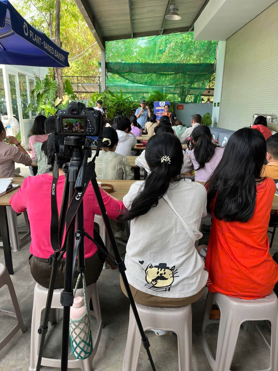 Workshop được tổ chức trong khuôn viên rộng rãi, bao quanh bởi cây xanh giúp người tham dự cảm thấy thư giãn và dễ hòa mình vào chương trình. Những chiếc bàn trưng bày đầy màu sắc với bánh thuần thực vật – từ bánh nướng, tart, donut đến bánh sáng tạo – khiến không gian thêm sinh động và thu hút ánh nhìn ngay khi vừa bước vào.